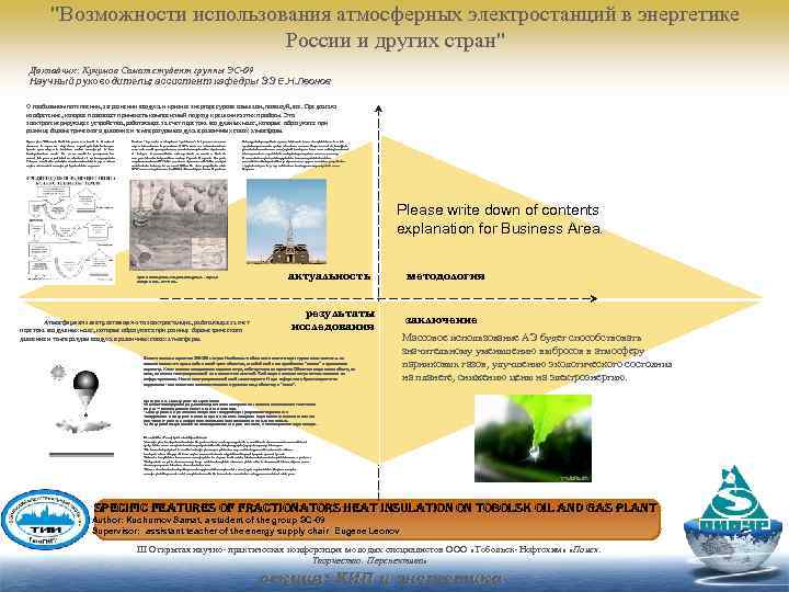 "Возможности использования атмосферных электростанций в энергетике России и других стран" Докладчик: Кучумов Самат студент группы ЭС-09 Научный руководитель: ассистент кафедры ЭЭ Е. Н. Леонов О глобальном потеплении, загрязнении воздуха и кризисе энергоресурсов слышали, пожалуй, все. Предлагаю изобретение, которое позволяет применять комплексный подход к решению этих проблем. Это электрогенерирующее устройство, работающее за счет перетока воздушных масс, которые образуются при разнице барометрического давления и температуры воздуха в различных слоях атмосферы. Примерно 40% солнечной энергии, падающей на Землю из космоса, в процессе обратного переизлучения некоторое время существует в нижних слоях атмосферы в виде электрического поля. На схеме показано распределение потока энергии и указаны механизмы её транспортировки. Таблица показывает какую мощность можно в предельном случае снимать из атмосферы в различных широтах Вообще - эту идею патентуют с "древности", без устали и до сих пор, с небольшими вариациями. В 19 -м столетии довольно много исследователей предпринимали попытки получить электричество из воздуха в достаточных для практики масштабах. Однако лидером явился, безусловно, доктор Герман Плаусон получил мощность 0, 72 к. Вт от одного аэростата и 3, 4 к. Вт от двух, поднятых на высоту всего лишь 300 м. На свои устройства он в 1920 -х годах получил патенты США, Великобритании и Германии. Конструкция устройства проста в выполнении и обслуживании, надежна при эксплуатации, не требует больших площадей при использовании. Для увеличения мощности атмосферной электростанции достаточно увеличить высоту подъема дирижабля, длину воздухопровода или его диаметр. В отдельных случаях конструктивно вместо дирижабля можно использовать воздушный шар, аэростат или другое подобное устройство, а турбоэлектрогенератор можно заменить другими преобразователем энергии. Please write down of contents explanation for Business Area. Проекты Плаусона. Рисунок из журнала «Наука и изобретение» 1922 года. Атмосферная электростанция-это электростанция, работающая за счет перетока воздушных масс, которые образуются при разнице барометрического давления и температуры воздуха в различных слоях атмосферы. актуальность методология результаты исследования заключение Высота подъема аэростата 300 -500 метров. Необходимо обеспечить достаточную грузоподъемность т. е. он должен поднимать кроме себя и своей чудо-оболочки, за собой ещё и вес крепёжного "каната" и проводника впридачу. Канат должен выдерживать порывы ветра, действующие на аэростат. Оболочка шара должна быть, по идее, не только электропроводной но и достаточно жесткой. Чтобы при давлении ветра по-возможности не деформировалась. Иначе электропроводный слой может сорвать. И при деформации будет возрастать и парусность - как следствие дополнительная нагрузка на саму оболочку и "канат". Массовое использование АЭ будет способствовать значительному уменьшению выбросов в атмосферу парниковых газов, улучшению экологического состояния на планете, снижению цены на электроэнергию. Преимущества атмосферных электростанций • Земельно-ионосферный суперконденсатор постоянно подзаряжается с помощью возобновляемых источников энергии — солнца и радиоактивных элементов земной коры. • Атмосферная электростанция не выбрасывае