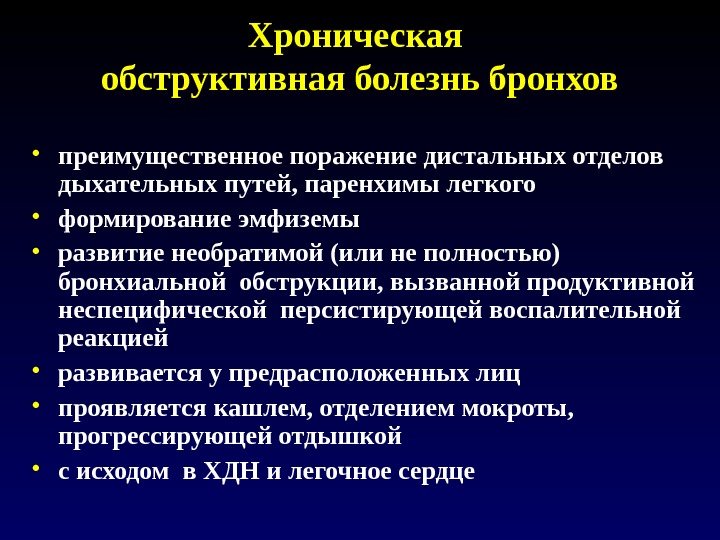 Хроническая обструктивная болезнь бронхов • преимущественное поражение дистальных отделов дыхательных путей, паренхимы легкого • формирование эмфиземы • развитие необратимой (или не полностью) бронхиальной обструкции, вызванной продуктивной неспецифической персистирующей воспалительной реакцией • развивается у предрасположенных лиц • проявляется кашлем, отделением мокроты, прогрессирующей отдышкой • с исходом в ХДН и легочное сердце