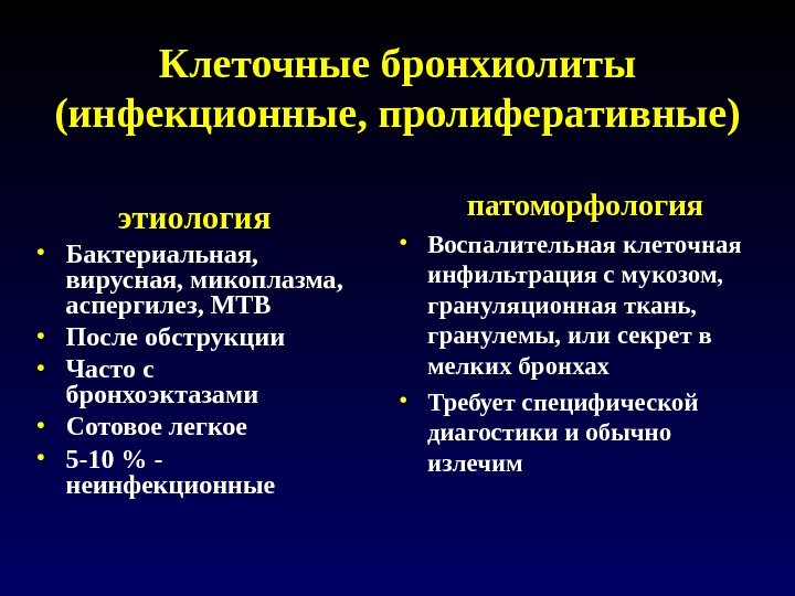 Клеточные бронхиолиты (инфекционные, пролиферативные) этиология • Бактериальная, вирусная, микоплазма, аспергилез, MTB • После обструкции • Часто с бронхоэктазами • Сотовое легкое • 5 -10 % — неинфекционные патоморфология • Воспалительная клеточная инфильтрация с мукозом, грануляционная ткань, гранулемы, или секрет в мелких бронхах • Требует специфической диагостики и обычно излечим