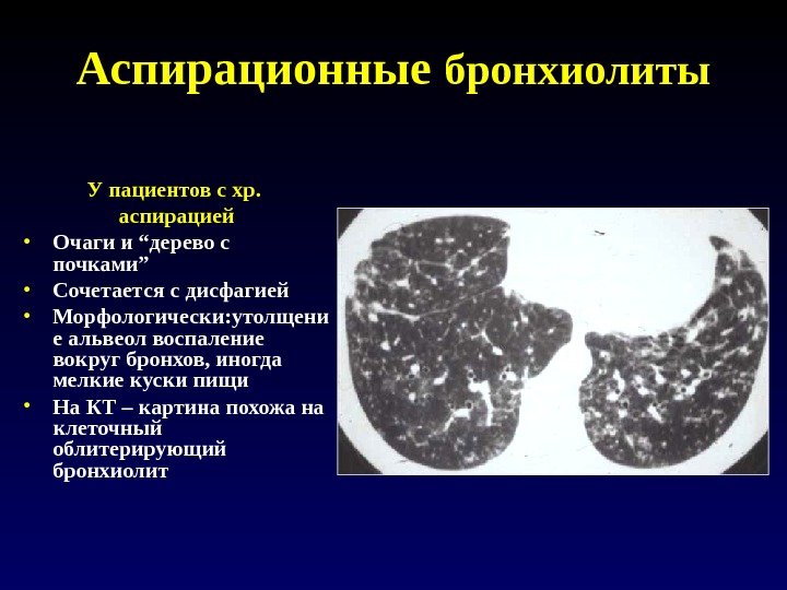Аспирационные бронхиолиты У пациентов с хр. а спирацией • Очаги и “дерево с почками” • Сочетается с дисфагией • Морфологически: утолщени е альвеол воспаление вокруг бронхов, иногда мелкие куски пищи • На КТ – картина похожа на клеточный облитерирующий бронхиолит