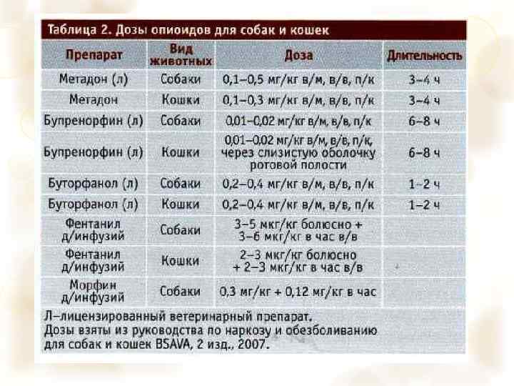 Наркотические препараты в ветеринарии А нужно ли обезболивать животных? Эффект облегчения боли заключается в снижении стрессовой реакции и нарушений снабжения тканей кислородом, сокращении времени нахождения животного в лежачем положении и улучшении подвижности, быстрейшем восстановлении функций, снижении вероятности непроходимости кишечника, облегчении послеоперационного обезболивания и большей удовлетворенности владельцев результатом Почему наркотические анальгетики? Опиоидные анальгетики считаются основным средством ММО во время хирургических вмешательств и являются наиболее эффективными и часто используемыми препаратами для лечения болей от умеренной до сильной выраженности