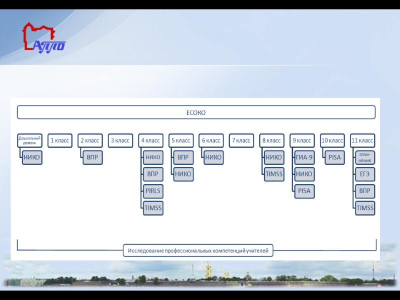 Подсистемы ЕСОКО МЕЖДУНАРОДНЫЕ ИССЛЕДОВАНИЯ: PIRLS предназначена для учащихся четвёртых классов и позволяет определить навыки детей в чтении и понимании текста. TIMSS позволяет определить навыки школьников четвёртых, восьмых и одиннадцатых классов по математике и естественнонаучным предметам. Исследование PISA нацелено на определение грамотности 15-летних школьников по таким направлениям, как естественные науки, математика, компьютерные технологии и чтение ИТОГОВАЯ ГОСАТТЕСТАЦИЯ НАЦИОНАЛЬНОЕ ИССЛЕДОВАНИЕ КАЧЕСТВА ОБРАЗОВАНИЯ (НИКО) Данная методика представляет собой срезы, аналогичные исследованиям международного уровня. В РФ она уже была испробована на учащихся 4-6 классов, что позволило определить наиболее проблемные зоны на уровне основной школы. ВСЕРОССИЙСКИЕ ПРОВЕРОЧНЫЕ РАБОТЫ (ВПР) ВПР учащиеся пишут по итогам годового обучения. Задания для такого вида работ разрабатывают согласно ФГОС, а полученные результаты вносятся в систему, которая позволяет затем обрабатывать и анализировать полученную информацию по каждому конкретному образовательному учреждению