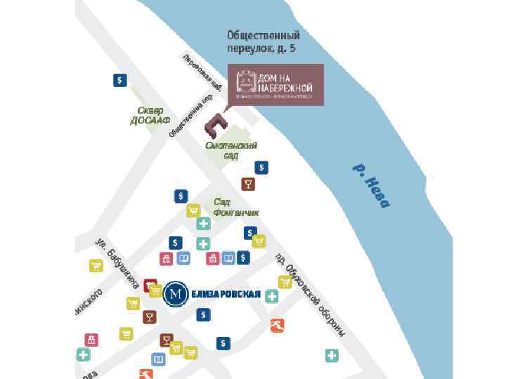 Преимущества расположения: • Пешеходная доступность станции метро «Елизаровская» (около 10 минут пешком), но не прямое соседство – отсутствие неблагоприятного соседства). • Хорошие видовые характеристики: часть квартир имеет вид на Неву. • Участок расположен на 2 -й линии домов от Обуховской обороны (вдали от шума и пыли). • Много зеленых зон отдыха - Смоленский сад, сквер ДОСААФ, сквер «Сад Фонтанчик» . • Хорошее транспортное сообщение с центром города: выезд по пр. Обуховской Обороны, до Невского пр. - 4 км (или 2 станции метро). • На противоположном берегу Невы существуют перспектива по редевелопированию промышленных территорий вдоль Октябрьской наб. такими компаниями как ЛСР, БФА, Seven Suns, что улучшит видовые характеристики участка. • Расположенный рядом с участком «Невский завод» (Силовые машины) также планируется комплексно редевелопировать. В результате лицо района полностью изменится – в район с новой жилой застройкой в 10 минутах от центра • Перевозная набережная не имеет транзитного движения. Таким образом жильцы дома имеют прекрасное пространство для прогулок и занятий спортом
