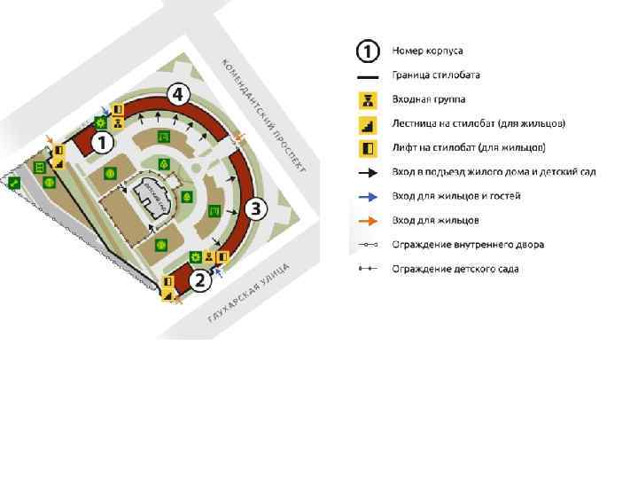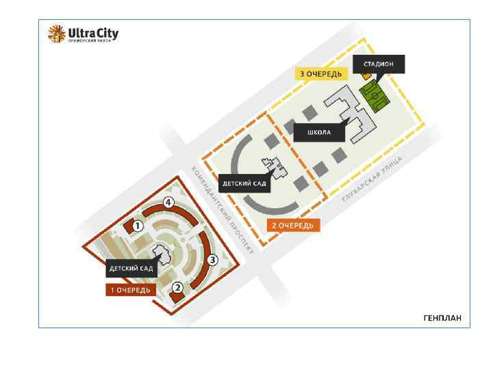 Жилой комплекс строится в три очереди: 1 очередь: 4 жилых здания, подземный паркинг, детский сад. 1 -ая очередь строится в 2 этапа: • 1 этап 1 -ой очереди: корпуса 1 и 4 + детский сад • 2 этап 1 -ой очереди: корпуса 2 и 3 + паркинг 2 очередь: 4 дома, автостоянки, детский сад. 3 очередь: 4 дома, паркинг, школа.
