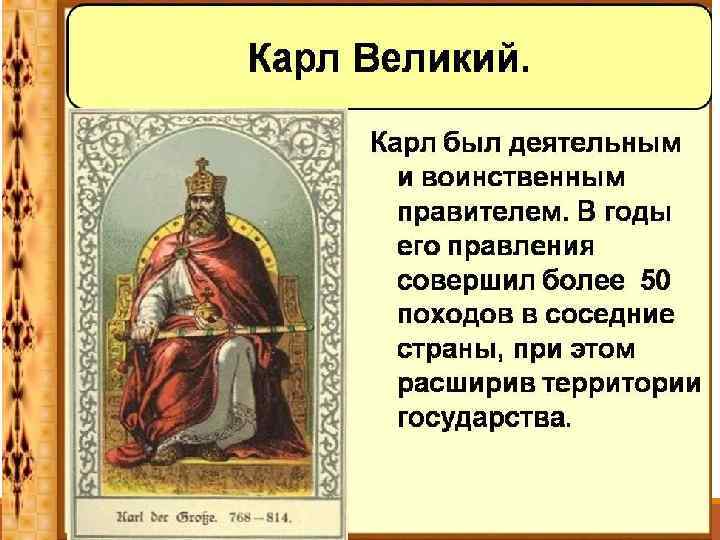 ЛИЧНОСТИ Карл Великий – Бертруда Лаонская Видукинд Лотарь Каролинги – династия франкских королей Карл Мартелл – майордом, имевший сильную власть Пипин Короткий – сын Карла Мартелла, основатель династии каролингов