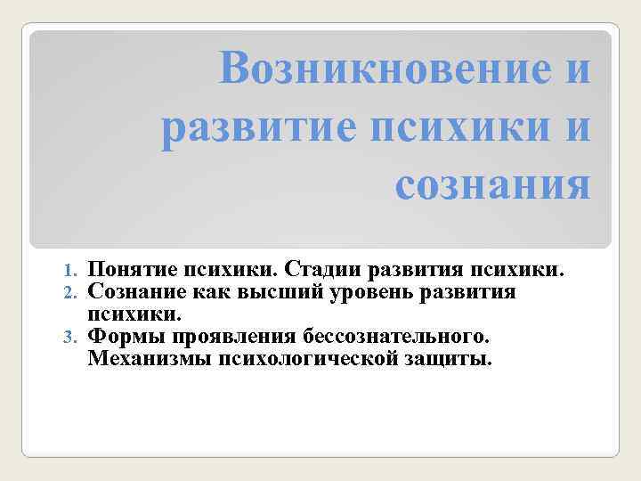 Возникновение и развитие психики и сознания Понятие психики. Стадии развития психики. Сознание как высший уровень развития психики. 3. Формы проявления бессознательного. Механизмы психологической защиты. 1. 2.