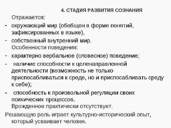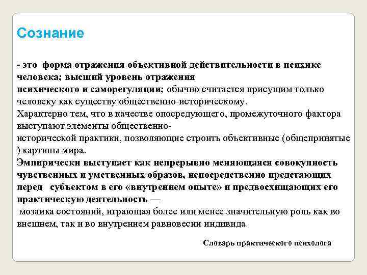 Сознание - это форма отражения объективной действительности в психике человека; высший уровень отражения психического и саморегуляции; обычно считается присущим только человеку как существу общественно-историческому. Характерно тем, что в качестве опосредующего, промежуточного фактора выступают элементы общественноисторической практики, позволяющие строить объективные (общепринятые ) картины мира. Эмпирически выступает как непрерывно меняющаяся совокупность чувственных и умственных образов, непосредственно предстающих перед субъектом в его «внутреннем опыте» и предвосхищающих его практическую деятельность — мозаика состояний, играющая более или менее значительную роль как во внешнем, так и во внутреннем равновесии индивида Словарь практического психолога