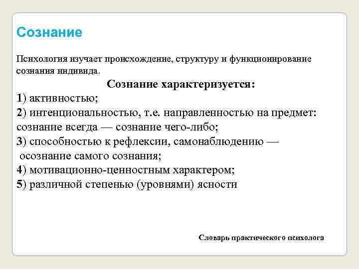 Сознание Психология изучает происхождение, структуру и функционирование сознания индивида. Сознание характеризуется: 1) активностью; 2) интенциональностью, т. е. направленностью на предмет: сознание всегда — сознание чего-либо; 3) способностью к рефлексии, самонаблюдению — осознание самого сознания; 4) мотивационно-ценностным характером; 5) различной степенью (уровнями) ясности Словарь практического психолога