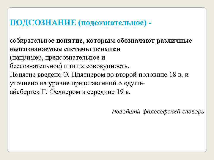 ПОДСОЗНАНИЕ (подсознательное) - собирательное понятие, которым обозначают различные неосознаваемые системы психики (например, предсознательное и бессознательное) или их совокупность. Понятие введено Э. Плятнером во второй половине 18 в. и уточнено на уровне представлений о «душеайсберге» Г. Фехнером в середине 19 в. Новейший философский словарь