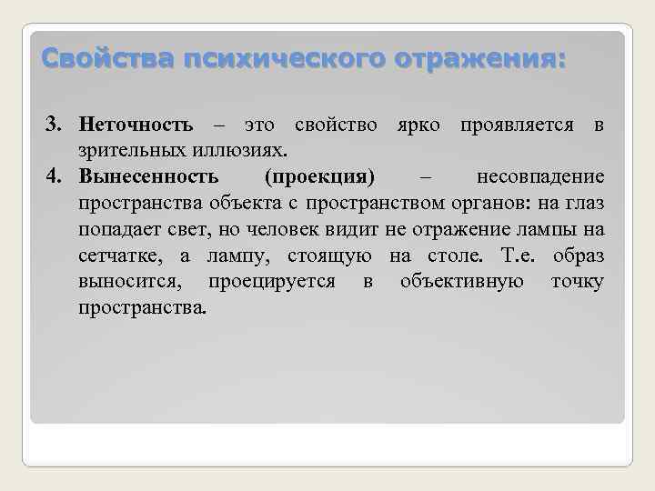Свойства психического отражения: 3. Неточность – это свойство ярко проявляется в зрительных иллюзиях. 4. Вынесенность (проекция) – несовпадение пространства объекта с пространством органов: на глаз попадает свет, но человек видит не отражение лампы на сетчатке, а лампу, стоящую на столе. Т. е. образ выносится, проецируется в объективную точку пространства.