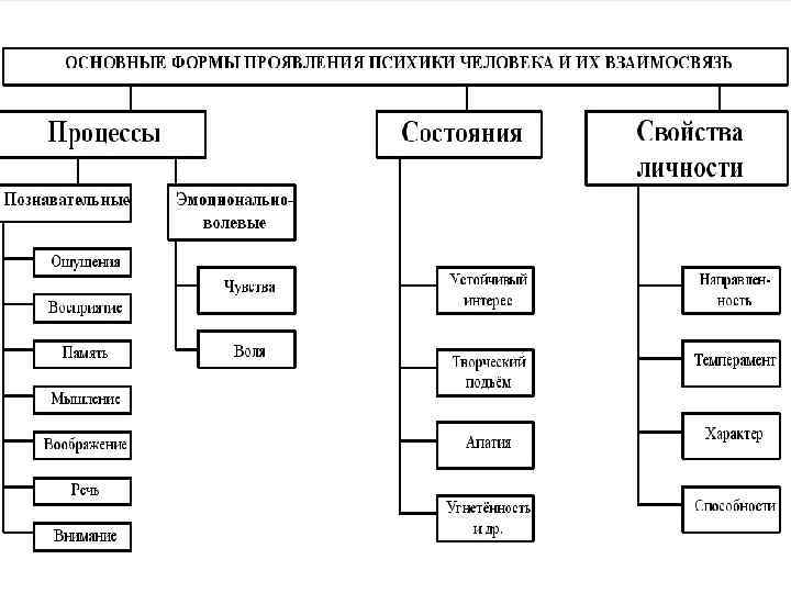 Структура психики ПСИХИЧЕСКИЕ ПРОЦЕССЫ – психические процессы обладают динамическими характеристиками; имеют определенное начало, течение и конец, могут иметь различную степень длительности и устойчивости. Психические процессы подразделяются на: познавательные (ощущение, восприятие, память, мышление и др. ) и эмоционально – волевые (эмоции, чувства; мотивы, стремления, желания, принятие решений) ПСИХИЧЕСКИЕ СОСТОЯНИЯ - относительно устойчивые психические явления, характеризующие психику в целом, определяющие особенности протекания конкретных психических процессов. Психические состояния характеризуются длительностью и устойчивостью. ПСИХИЧЕСКИЕ СВОЙСТВА – это наиболее устойчивые особенности личности. Они определяют специфику поведения и деятельности данного человека. Психические свойства личности подразделяются на: темперамент, направленность, характер, способности