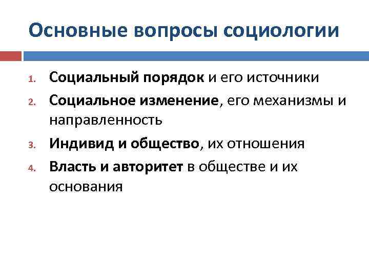 Основные вопросы социологии 1. 2. 3. 4. Социальный порядок и его источники Социальное изменение, его механизмы и направленность Индивид и общество, их отношения Власть и авторитет в обществе и их основания
