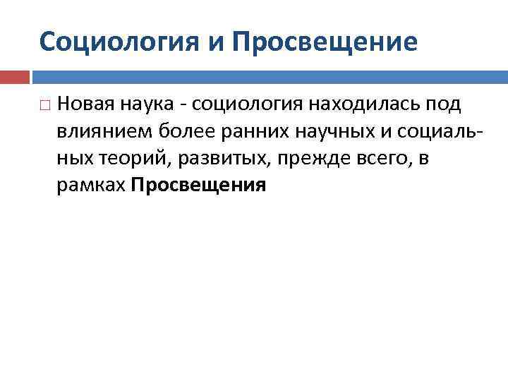 Социология и Просвещение Новая наука - социология находилась под влиянием более ранних научных и социальных теорий, развитых, прежде всего, в рамках Просвещения