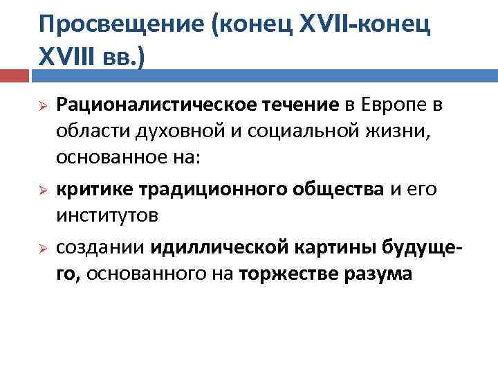 Просвещение (конец XVII-конец XVIII вв. ) Рационалистическое течение в Европе в области духовной и социальной жизни, основанное на: Ø критике традиционного общества и его институтов Ø создании идиллической картины будущего, основанного на торжестве разума Ø