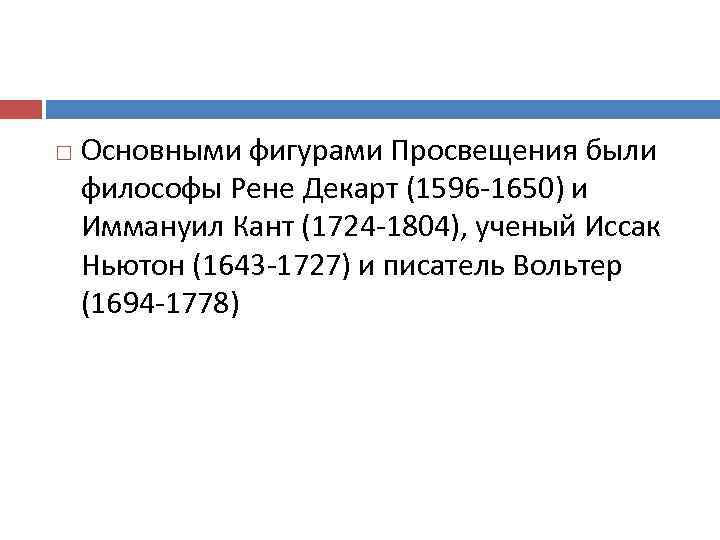 Основными фигурами Просвещения были философы Рене Декарт (1596 -1650) и Иммануил Кант (1724 -1804), ученый Иссак Ньютон (1643 -1727) и писатель Вольтер (1694 -1778)