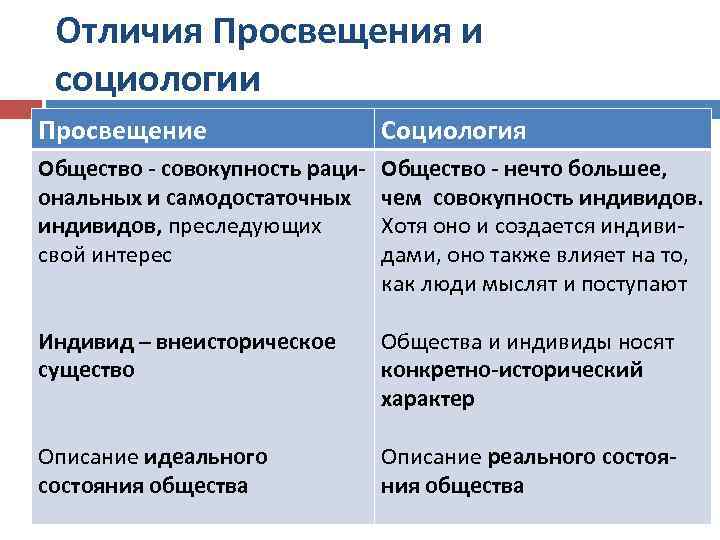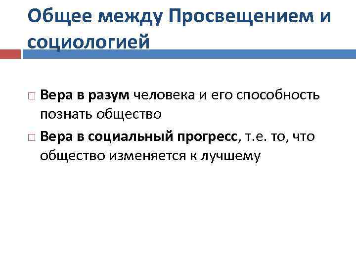 Общее между Просвещением и социологией Вера в разум человека и его способность познать общество Вера в социальный прогресс, т. е. то, что общество изменяется к лучшему