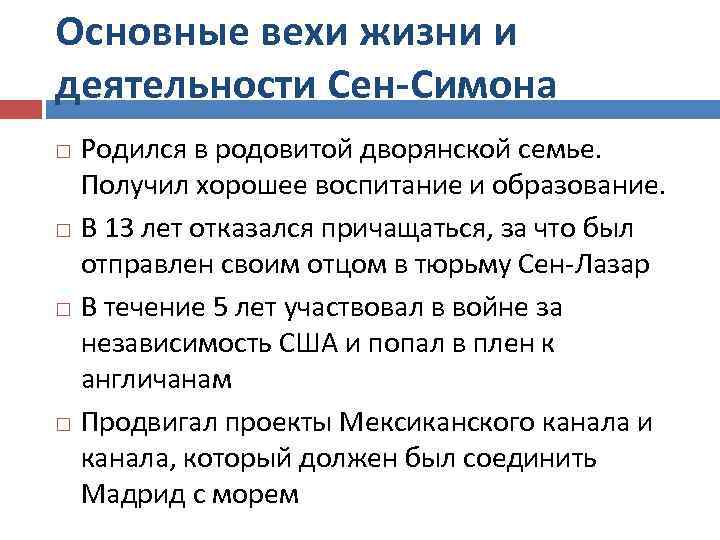 Основные вехи жизни и деятельности Сен-Симона Родился в родовитой дворянской семье. Получил хорошее воспитание и образование. В 13 лет отказался причащаться, за что был отправлен своим отцом в тюрьму Сен-Лазар В течение 5 лет участвовал в войне за независимость США и попал в плен к англичанам Продвигал проекты Мексиканского канала и канала, который должен был соединить Мадрид с морем