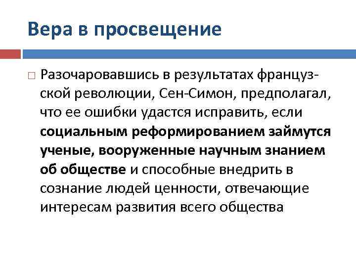 Вера в просвещение Разочаровавшись в результатах французской революции, Сен-Симон, предполагал, что ее ошибки удастся исправить, если социальным реформированием займутся ученые, вооруженные научным знанием об обществе и способные внедрить в сознание людей ценности, отвечающие интересам развития всего общества
