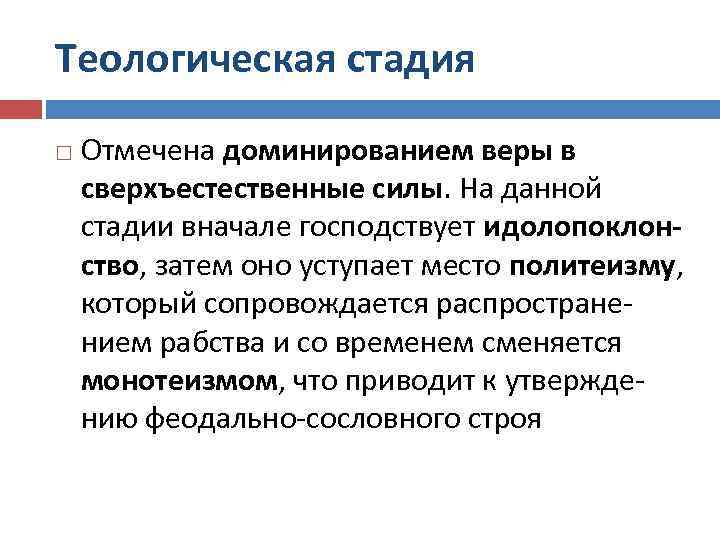 Теологическая стадия Отмечена доминированием веры в сверхъестественные силы. На данной стадии вначале господствует идолопоклонство, затем оно уступает место политеизму, который сопровождается распространением рабства и со временем сменяется монотеизмом, что приводит к утверждению феодально-сословного строя