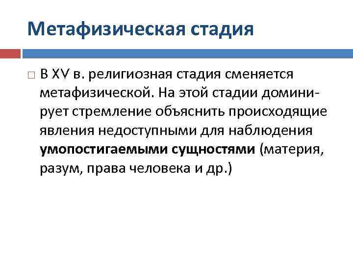 Метафизическая стадия В XV в. религиозная стадия сменяется метафизической. На этой стадии доминирует стремление объяснить происходящие явления недоступными для наблюдения умопостигаемыми сущностями (материя, разум, права человека и др. )