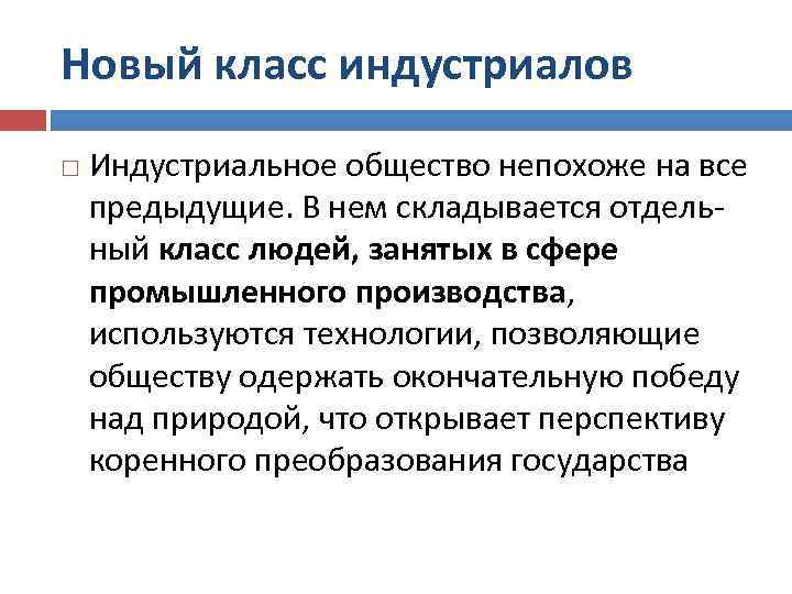 Новый класс индустриалов Индустриальное общество непохоже на все предыдущие. В нем складывается отдельный класс людей, занятых в сфере промышленного производства, используются технологии, позволяющие обществу одержать окончательную победу над природой, что открывает перспективу коренного преобразования государства