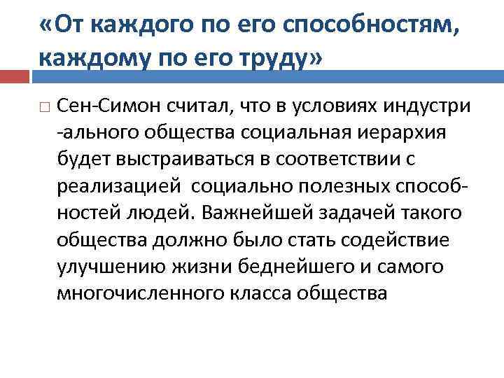 «От каждого по его способностям, каждому по его труду» Сен-Симон считал, что в условиях индустри -ального общества социальная иерархия будет выстраиваться в соответствии с реализацией социально полезных способностей людей. Важнейшей задачей такого общества должно было стать содействие улучшению жизни беднейшего и самого многочисленного класса общества