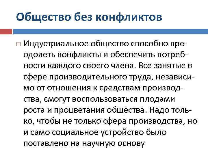 Общество без конфликтов Индустриальное общество способно преодолеть конфликты и обеспечить потребности каждого своего члена. Все занятые в сфере производительного труда, независимо от отношения к средствам производства, смогут воспользоваться плодами роста и процветания общества. Надо только, чтобы не только сфера производства, но и само социальное устройство было поставлено на научную основу