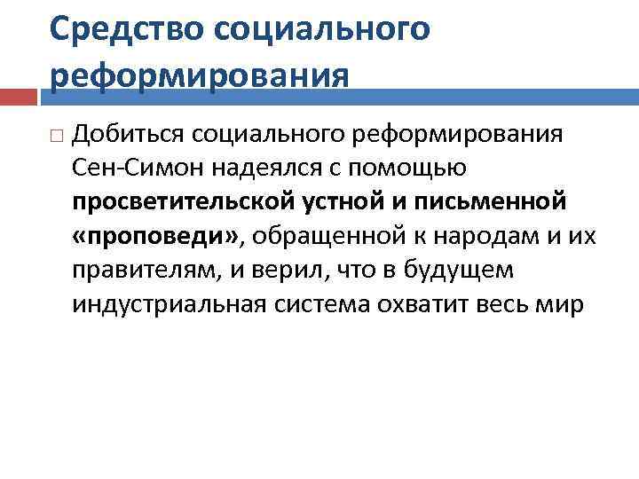 Средство социального реформирования Добиться социального реформирования Сен-Симон надеялся с помощью просветительской устной и письменной «проповеди» , обращенной к народам и их правителям, и верил, что в будущем индустриальная система охватит весь мир