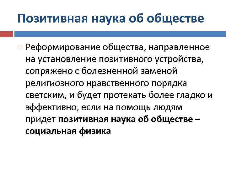 Позитивная наука об обществе Реформирование общества, направленное на установление позитивного устройства, сопряжено с болезненной заменой религиозного нравственного порядка светским, и будет протекать более гладко и эффективно, если на помощь людям придет позитивная наука об обществе – социальная физика