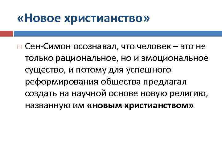 «Новое христианство» Сен-Симон осознавал, что человек – это не только рациональное, но и эмоциональное существо, и потому для успешного реформирования общества предлагал создать на научной основе новую религию, названную им «новым христианством»