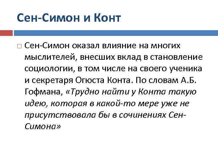 Сен-Симон и Конт Сен-Симон оказал влияние на многих мыслителей, внесших вклад в становление социологии, в том числе на своего ученика и секретаря Огюста Конта. По словам А. Б. Гофмана, «Трудно найти у Конта такую идею, которая в какой-то мере уже не присутствовала бы в сочинениях Сен. Симона»