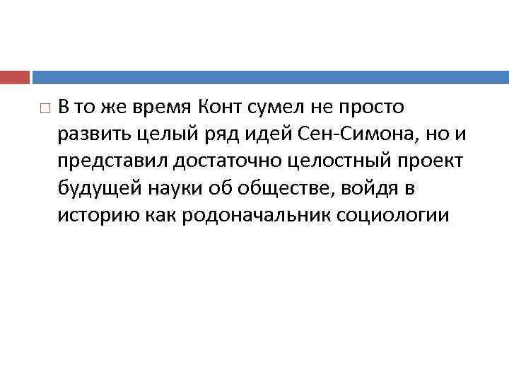 В то же время Конт сумел не просто развить целый ряд идей Сен-Симона, но и представил достаточно целостный проект будущей науки об обществе, войдя в историю как родоначальник социологии