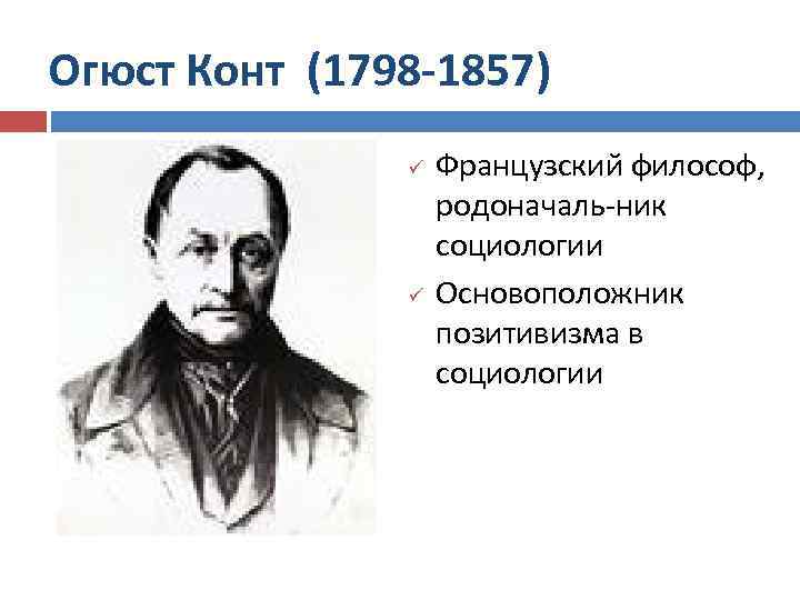 Огюст Конт (1798 -1857) ü ü Французский философ, родоначаль-ник социологии Основоположник позитивизма в социологии