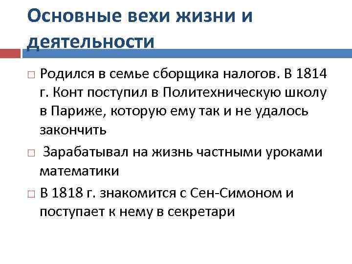 Основные вехи жизни и деятельности Родился в семье сборщика налогов. В 1814 г. Конт поступил в Политехническую школу в Париже, которую ему так и не удалось закончить Зарабатывал на жизнь частными уроками математики В 1818 г. знакомится с Сен-Симоном и поступает к нему в секретари