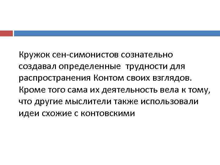 Кружок сен-симонистов сознательно создавал определенные трудности для распространения Контом своих взглядов. Кроме того сама их деятельность вела к тому, что другие мыслители также использовали идеи схожие с контовскими