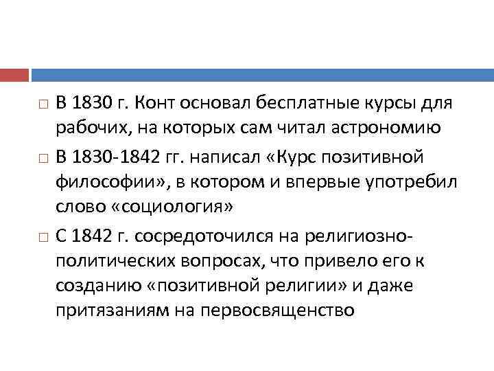 В 1830 г. Конт основал бесплатные курсы для рабочих, на которых сам читал астрономию В 1830 -1842 гг. написал «Курс позитивной философии» , в котором и впервые употребил слово «социология» С 1842 г. сосредоточился на религиознополитических вопросах, что привело его к созданию «позитивной религии» и даже притязаниям на первосвященство