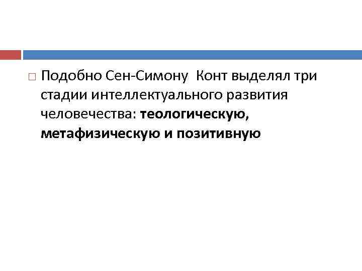Подобно Сен-Симону Конт выделял три стадии интеллектуального развития человечества: теологическую, метафизическую и позитивную