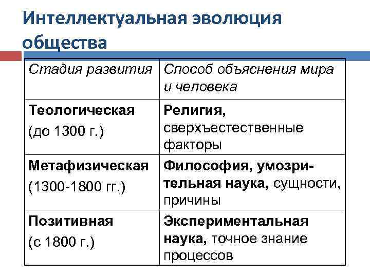 Интеллектуальная эволюция общества Стадия развития Способ объяснения мира и человека Теологическая (до 1300 г. ) Метафизическая (1300 -1800 гг. ) Позитивная (с 1800 г. ) Религия, сверхъестественные факторы Философия, умозрительная наука, сущности, причины Экспериментальная наука, точное знание процессов