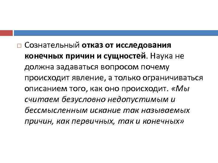 Сознательный отказ от исследования конечных причин и сущностей. Наука не должна задаваться вопросом почему происходит явление, а только ограничиваться описанием того, как оно происходит. «Мы считаем безусловно недопустимым и бессмысленным искание так называемых причин, как первичных, так и конечных»