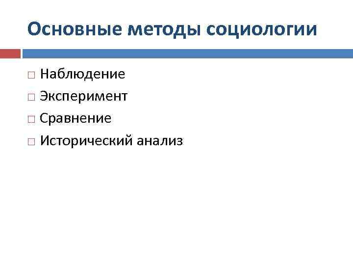 Основные методы социологии Наблюдение Эксперимент Сравнение Исторический анализ