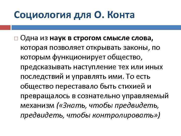 Социология для О. Конта Одна из наук в строгом смысле слова, которая позволяет открывать законы, по которым функционирует общество, предсказывать наступление тех или иных последствий и управлять ими. То есть общество переставало быть стихией и превращалось в сознательно управляемый механизм ( «Знать, чтобы предвидеть, чтобы контролировать» )