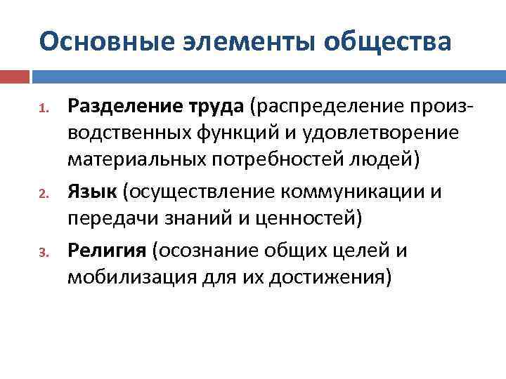 Основные элементы общества 1. 2. 3. Разделение труда (распределение производственных функций и удовлетворение материальных потребностей людей) Язык (осуществление коммуникации и передачи знаний и ценностей) Религия (осознание общих целей и мобилизация для их достижения)