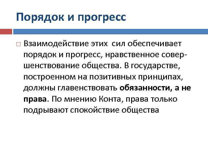 Порядок и прогресс Взаимодействие этих сил обеспечивает порядок и прогресс, нравственное совершенствование общества. В государстве, построенном на позитивных принципах, должны главенствовать обязанности, а не права. По мнению Конта, права только подрывают спокойствие общества