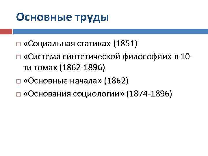 Основные труды «Социальная статика» (1851) «Система синтетической философии» в 10 ти томах (1862 -1896) «Основные начала» (1862) «Основания социологии» (1874 -1896)