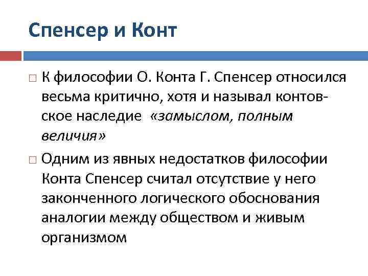Спенсер и Конт К философии О. Конта Г. Спенсер относился весьма критично, хотя и называл контовское наследие «замыслом, полным величия» Одним из явных недостатков философии Конта Спенсер считал отсутствие у него законченного логического обоснования аналогии между обществом и живым организмом