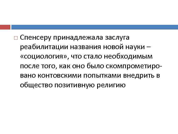 Спенсеру принадлежала заслуга реабилитации названия новой науки – «социология» , что стало необходимым после того, как оно было скомпрометировано контовскими попытками внедрить в общество позитивную религию