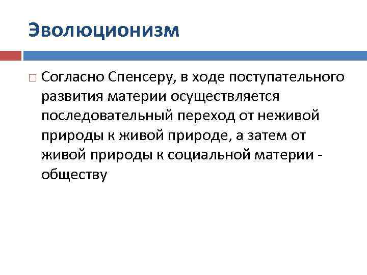 Эволюционизм Согласно Спенсеру, в ходе поступательного развития материи осуществляется последовательный переход от неживой природы к живой природе, а затем от живой природы к социальной материи - обществу