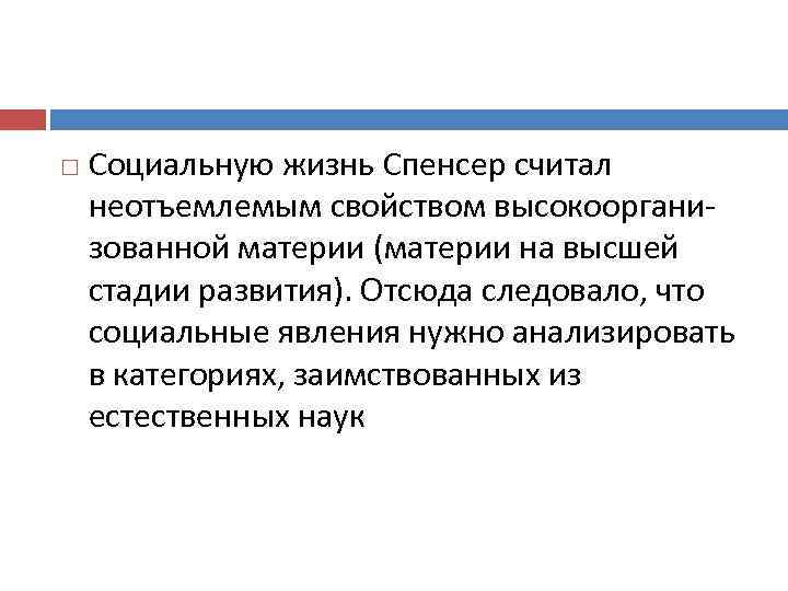 Социальную жизнь Спенсер считал неотъемлемым свойством высокоорганизованной материи (материи на высшей стадии развития). Отсюда следовало, что социальные явления нужно анализировать в категориях, заимствованных из естественных наук