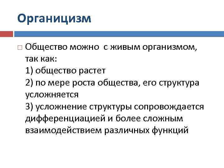 Органицизм Общество можно с живым организмом, так как: 1) общество растет 2) по мере роста общества, его структура усложняется 3) усложнение структуры сопровождается дифференциацией и более сложным взаимодействием различных функций