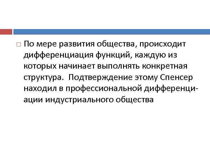 По мере развития общества, происходит дифференциация функций, каждую из которых начинает выполнять конкретная структура. Подтверждение этому Спенсер находил в профессиональной дифференциации индустриального общества